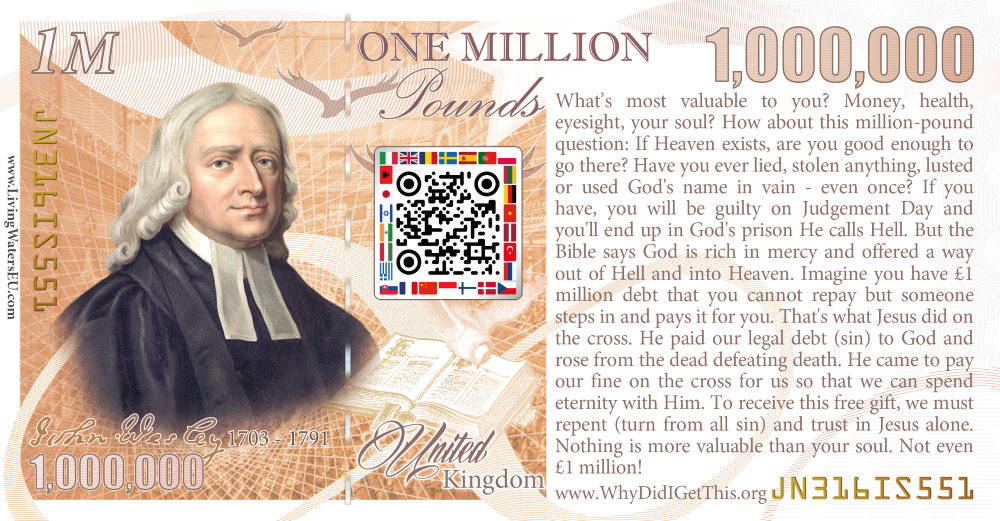 What’s most valuable to you? Money, health, eyesight, your soul? How about this million-pound question: If Heaven exists, are you good enough to go there? Have you ever lied, stolen anything, lusted or used God's name in vain - even once? If you have, you will be guilty on Judgement Day and you'll end up in God's prison He calls Hell. But the Bible says God is rich in mercy and offered a way out of Hell and into Heaven. Imagine you have £1 million debt that you cannot repay but someone steps in and pays it for you. That's what Jesus did on the cross. He paid our legal debt (sin) to God and rose from the dead defeating death. He came to pay our fine on the cross for us so that we can spend eternity with Him. To receive this free gift, we must repent (turn from all sin) and trust in Jesus alone. Nothing is more valuable than your soul. Not even £1 million! www.WhyDidIGetThis.org