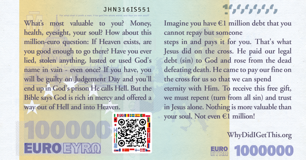 eternity with Him. To receive this free gift, we must repent (turn from all sin) and trust in Jesus alone. Nothing is more valuable than your soul. Not even €1 million! www.WhyDidIGetThis.org[The QR Code takes you to a Gospel website which is translated into over 15 languages including: English, French, German, Spanish, Italian, Romanian, Portuguese, Swedish, Dutch, Polish, Russian, Ukrainian, Hindi, Chinese, Arabic, and Swahili]
